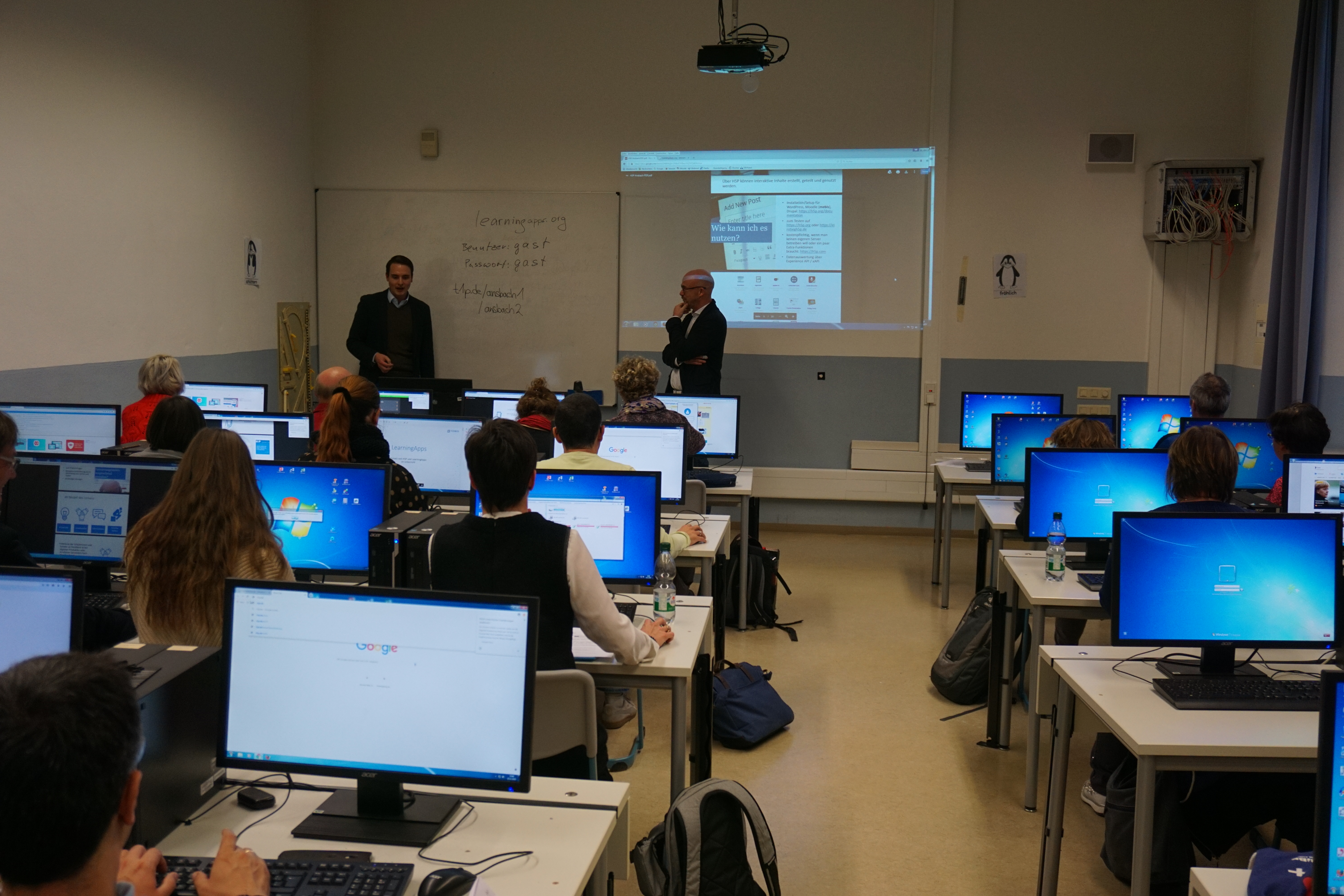Im Rahmen unseres Erasmus-Projektes „Wissen teilen, gemeinsam digitale Bildung gestalten“ besuchte uns Mitte November von Donnerstag bis Sonntag eine Gruppe von Lehrkräften unserer Partnerschule, der TFO Meran. Am Abend des Anreisetages gingen die Meraner KollegInnen mit einigen Ansbacher Lehrern gemeinsam Essen, am nächsten Tag traf man sich dann in der FOS/BOS Ansbach. Dort gab es für die Besucher die Gelegenheit zu Unterrichtshospitationen, gefolgt von einer Stadtführung durch Ansbach und einem gemeinsamen Mittags-Buffet in der Schule. Damit war man gestärkt für den gemeinsamen Fortbildungsnachmittag zum Thema: „Interaktive Lernobjekte mit LearningApps und H5P gestalten“