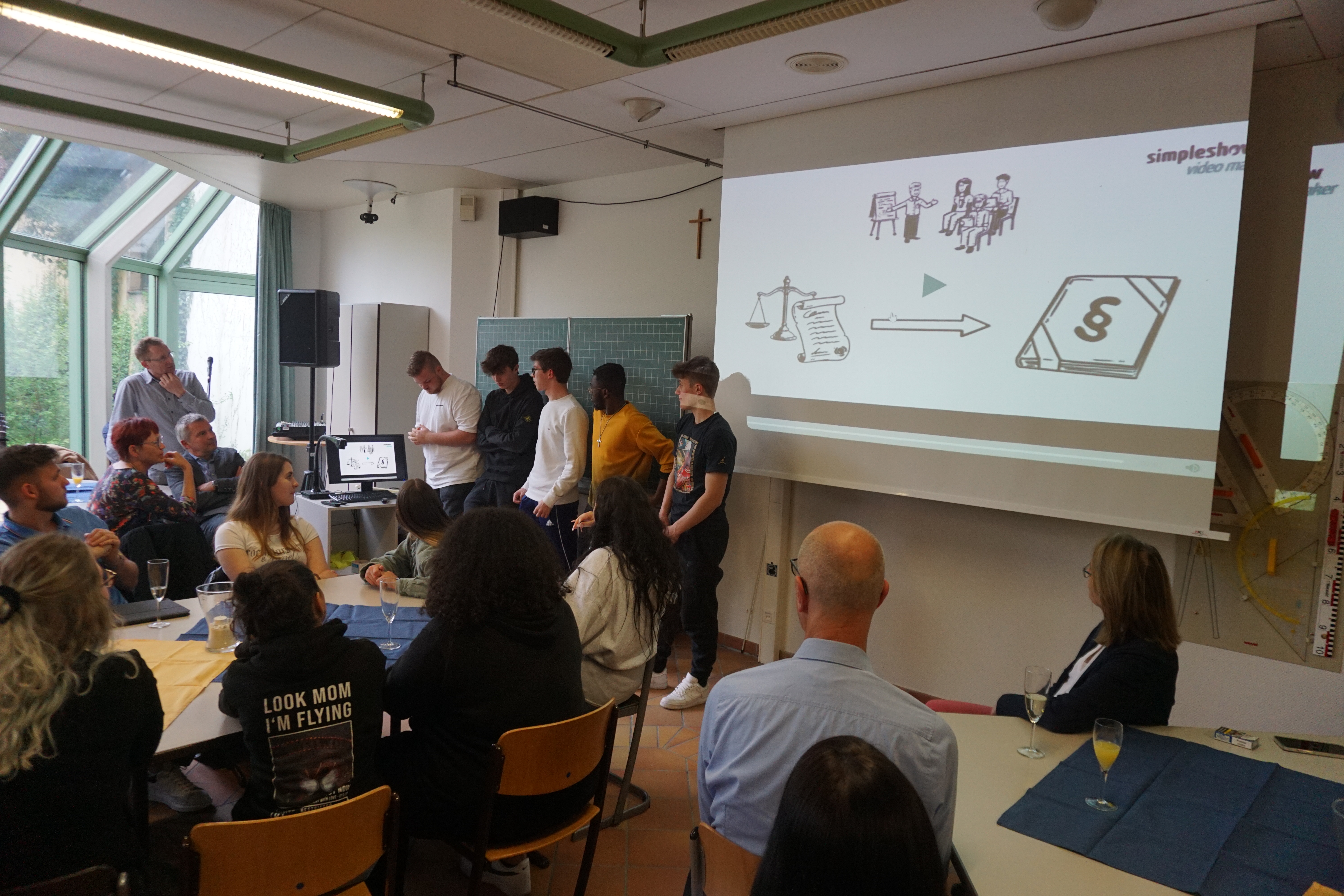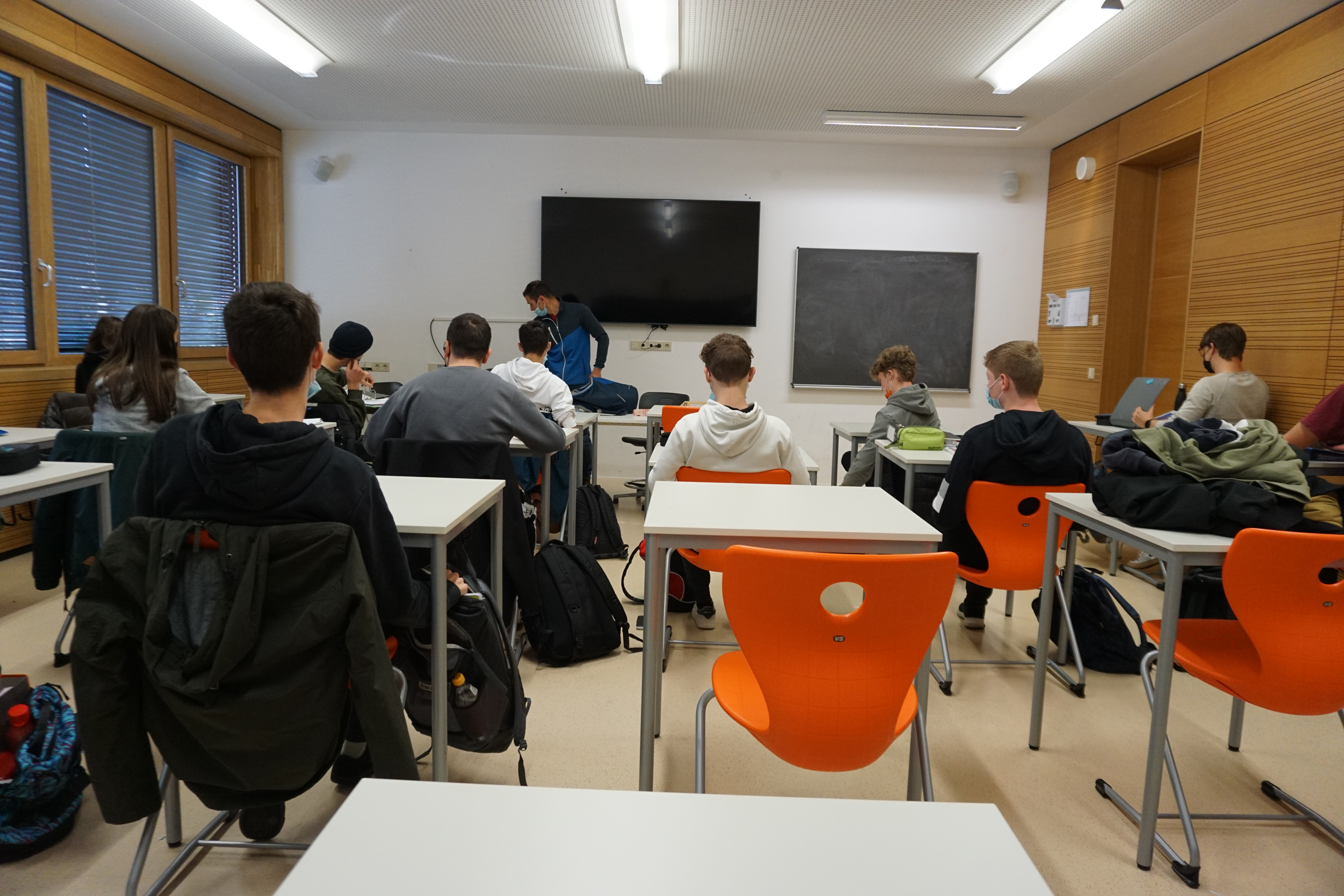 Am Folgetag lernte die Klasse die Schüler:innen der Partnerklasse kennen. Es wurden gemischte Teams für das gemeinsame Projekt zum Thema „Demokratie und Rechtsstaatlichkeit als Herausforderung im Gemeinsamen Europa“ gebildet, wobei man dann eines der Unterthemen, die sich stets sowohl auf Südtirol als auch auf Deutschland bezogen, und ein digitales Format, in welchem die Ergebnisse präsentiert werden sollten, aussuchte. Im Rahmen des projektübergreifen Themas der Digitalisierung wurde dann in Teamarbeit begonnen digitale Produkte wir Podcasts, Lernvideos und vertonte Präsentationen zu erstellen. Neben einem Empfang bei Vizebürgermeisterin Katharina Johanna Zeller im Rathaus wurden auch die Meraner Synagoge und das dortige Museum besichtigt.