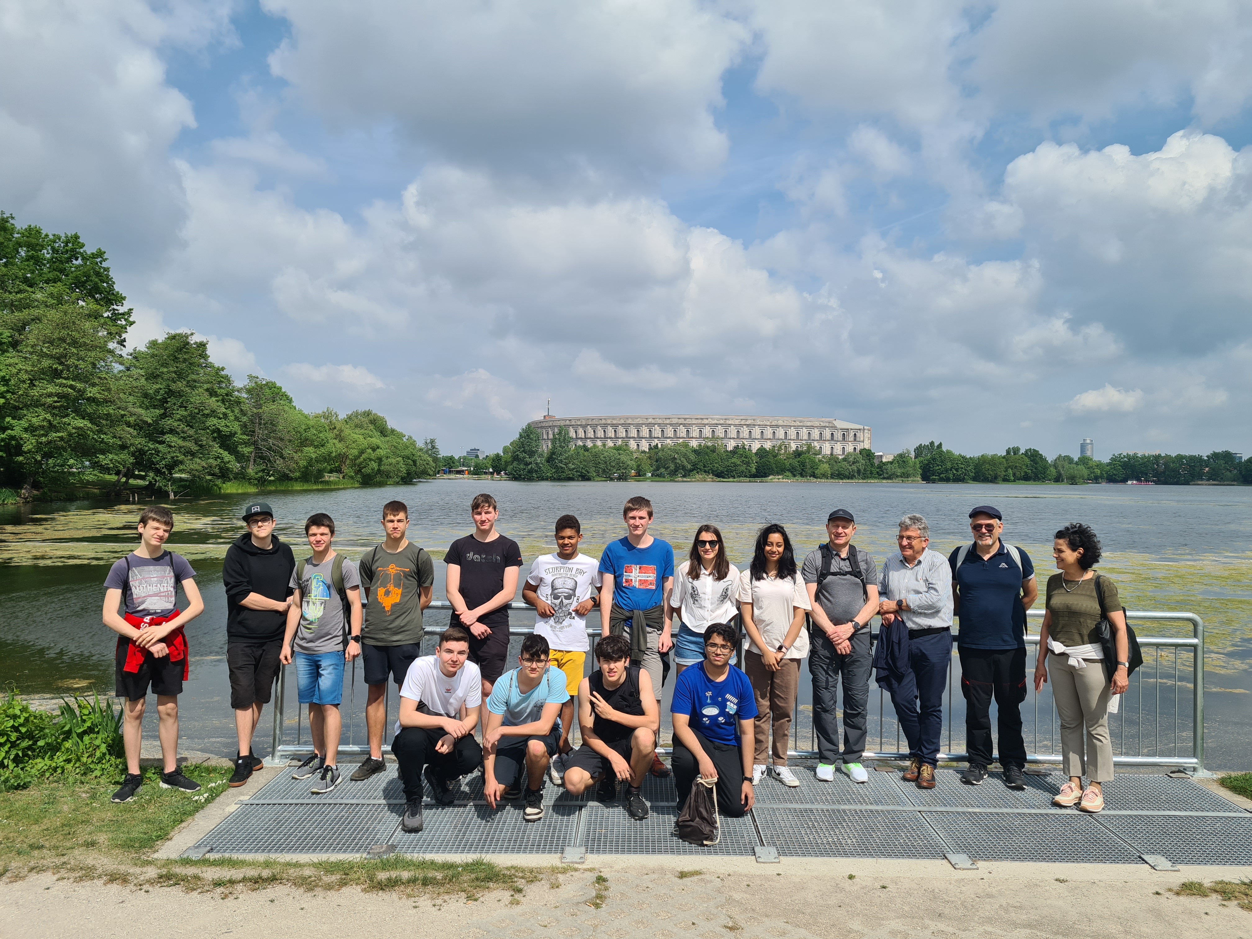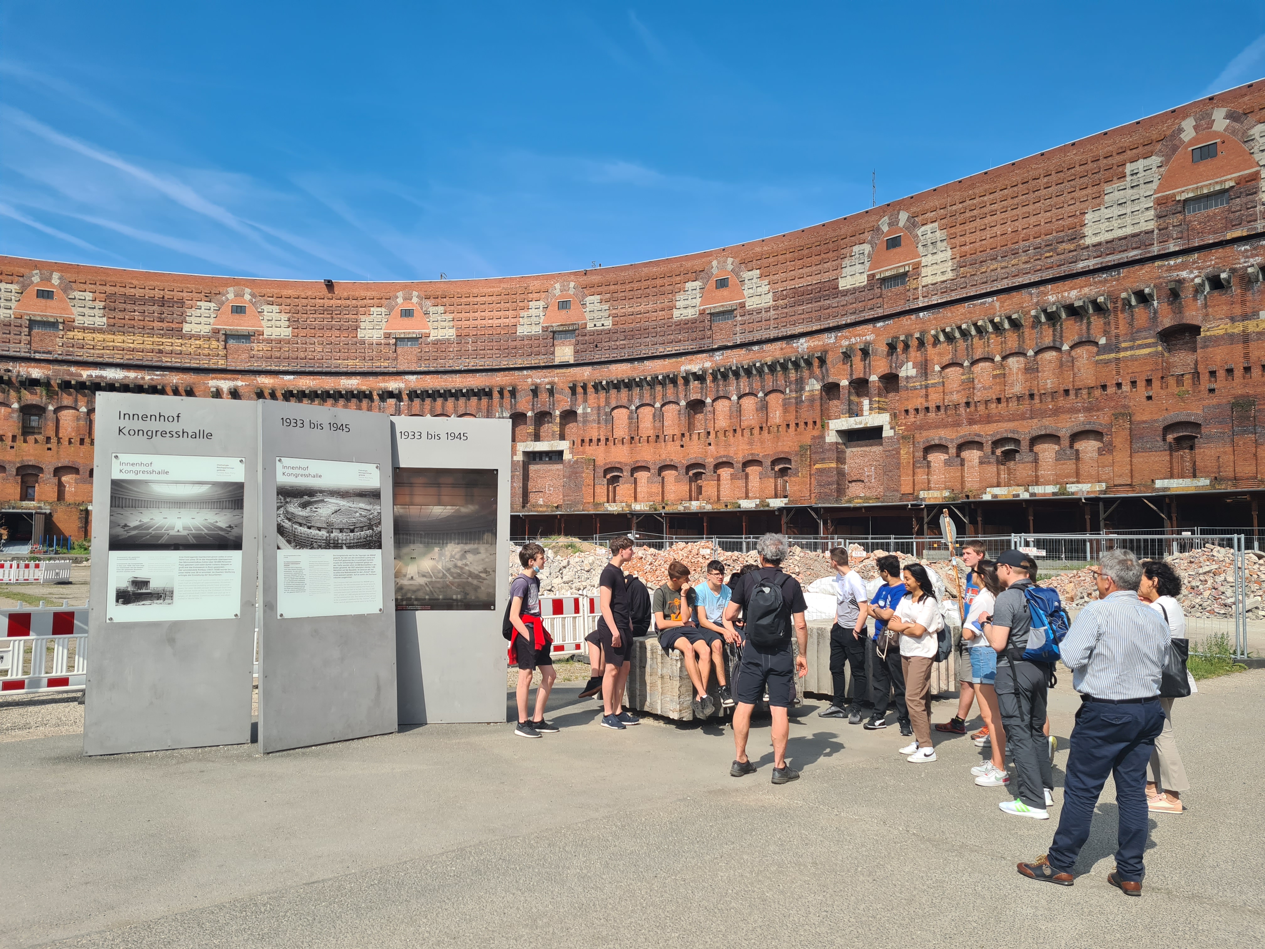 Am folgenden Dienstag unternahmen die beiden Klassen dann in Begleitung von Direktor Helmreich und Dr. Wolfgang Simon einen Ausflug nach Nürnberg. Dort machte man erst einen kurzen Abstecher zum Memorium Nürnberger Prozesse, wo die beiden mit der Thematik vertrauten begleitenden Ansbacher Kollegen die Gäste und die eigenen SchülerInnen mit der Geschichte der Nürnberger Prozesse vertraut machten. Danach besuchte man die Ausstellung im Dokumentationszentrum zu den Nürnberger Reichsparteitagen, bevor man gestärkt nach einem gemeinsamen Mittagessen noch eine Führung eines Rundgangsleiters von „Geschichte für Alle“ über das weitläufige ehemalige Reichsparteitagsgelände bekam. Hierbei wurde allen erst so richtig bewusst, mit welcher Gigantomanie die Nationalsozialisten den architektonischen Ausdruck ihrer Ideologie betrieben. Im Anschluss wurden die SchülerInnen dann zur gemeinsamen Stadterkundung entlassen, während die verbliebenen heimischen Lehrkräfte den Meranern noch einige kulturelle Highlights Nürnbergs zeigten, bevor man wieder die Heimreise nach Ansbach antrat. Die Schüler:innen haben durch die Exkursion nach Nürnberg noch einmal eine Menge Informationen zum Umgang mit der nationalsozialistischen Vergangenheit in Deutschland erlangt und dies im Vergleich zum Umgang Italiens mit seiner faschistischen Vergangenheit erfahren. Dadurch erhielten sie weitere wichtige Wissensbausteine um ihre Podcasts, Lernvideos oder vertonten Präsentationen zu erstellen.