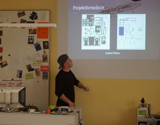 Da die Gruppe aus Meran aus Schülern des Elektrotechnik Zweiges bestand, bot sich ein gegenseitiger Austausch über Projekte mit unserer E-Werkstatt an: Im Zentrum standen hier zwei Uhren, das Propelleruhrprojekt eines Meraner Schülers und eine LED Wortuhr (eine Uhr, die die Zeit in Worten anzeigt, siehe untere Bilder), die Ansbacher Schüler programmierten.